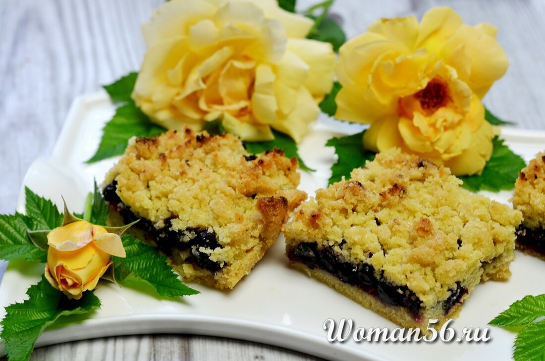 Насыпной пирог с черной смородиной ставят в духовку, температура – 180 градусов. Через 40 минут пирог будет готов. Горячий пирог нельзя достать в одиночку, он может легко поломаться. Вынимают его из формы вдвоем, держа за края кулинарной бумаги. Горячий пирог разрезают на квадраты и подают к чаю.