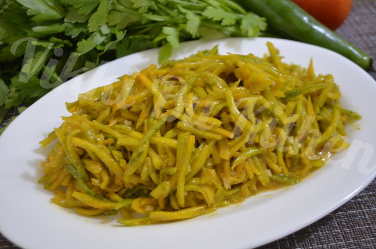 Если говорить о вкусе этого совершенно простого блюда, а точнее, закуски, то это что-то среднее между огурцом, кабачком и морковью. На тыкву, по факту, не особо и не похоже. Количество порций: 3-4 Время приготовления: 15 минут Энергетическая ценность Ингредиенты Пошаговое приготовление Разрежьте тыкву на несколько сегментов. Выньте волокна с семенами. Снимите кожицу. Натрите на специальной терке. Присыпьте солью. Перемешайте. Тыква даст сок почти сразу. Добавьте приправу и залейте раскаленным маслом. Перемешайте. Я, когда попробовала, поняла, что мне чего-то не хватает. Добавила чеснок и совсем немного сахара. Также на этом этапе стоит влить уксус. Оставьте закуску минимум на час. У меня она мариновалась ночь. И вкус ее стал только лучше и насыщенней. Приятного аппетита! Понравилась статья? Ставим лайк и подписываемся!