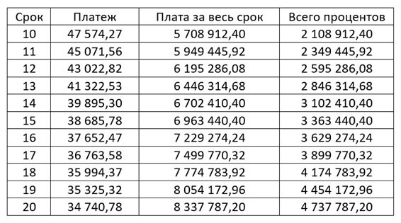 Актуальны вопрос ипотечного кредитования встает, когда аренда в целом может сравниться с платой по ипотеке, но когда берешь ипотеку, квартира то становится "своей". Но! актуальным становится вопрос а на сколько лет брать то? может быть на больший срок, так и платить будет совсем легко. А может быть и нет... Давайте разберемся с этим вместе. Возьмем условную квартиру за 4 млн. рублей. Рассматривать будем ситуацию условный процент, который равен 10 Практически любой банк одобрит ипотеку, если первоначальный взнос составляет 10%, в нашем случае это 400 т.р. Начинать будем со срока 10 лет, потому что в среднем в РФ ипотеку берут на 15 лет, сделаем шаг в пять лет в одну и другую строну. В таблице видно, что разница между сроками 10 и 11 лет в ежемесячном платеже составляет 2502,71 руб. и разница в выплаченных процентах 240533,52 руб., а между сроками 19 и 20 лет в еж. платеже 584,54 и в % 283614,24 руб. Можно сделать вывод о том, что увеличение количества лет не всегда эффективно, если в