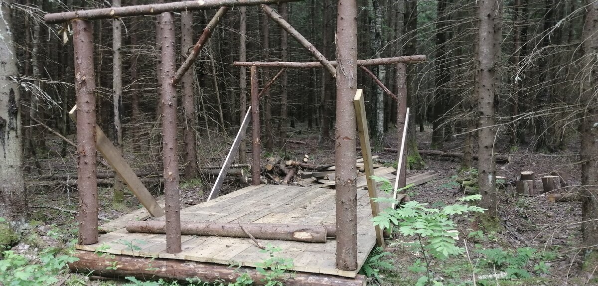 Здравствуйте любители леса и природы. Будьте здравы и богаты! Скитаясь по лесу, на днях обнаружил странное сооружение. Сразу уточню-до ближайшего жилья, по навигатору, по прямой ровно 12 км. Глухой ельник, посадки еще при коммунистах. Ближайшая в хлам заросшая, старая лесовозная дорога-по прямой, ровно 700 метров. На дороге просматривается старый, замытый дождями, след квадроцикла с прицепом. Колея прицепа немного шире, посему и определил. Подъезда к месту постройки, нет от слова совсем. Обошел два полных круга, увеличивая диаметр. Вывод однозначен-стройматериалы носили на руках! Как видно на фото-пол в постройке, выполнен из обрезной доски пятидесятки. На заднем плане, просматривается небольшой штабель таких-же досок. Первым делом, позвонил местному охотоведу, тот ничего слыхом не слыхивал.