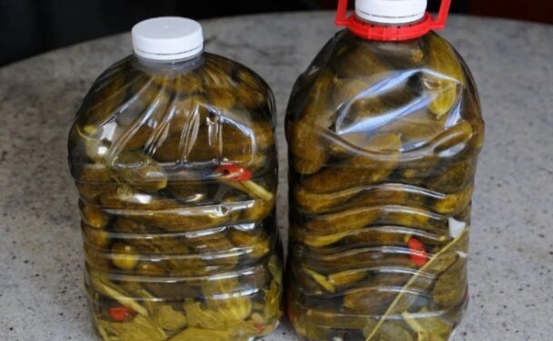 Этот рецепт уже необычный только тем, что для соления мы используем пластиковую посуду. Во время консерваций частенько не хватает стеклянной тары. И вот тогда, нам пригодятся пластиковые бутылки на 5 литров. По этому рецепту соленые огурцы получаются такими же вкусными, как из бочки. В пластиковую бутылку, на 5 литров, сначала кладем зелень. Если Вы предпочитаете другую, то, смело, можете воспользоваться таковой. Затем очередь огурцов, и сверху, снова, зелень. Потом кладем необходимое количество соли и вливаем воду. Воду используем дистиллированную или чистую отстоянную. Вместо крышки используем чистую марлю, а саму бутылку нужно положить в подходящую миску, чтоб туда стекала жидкость, когда начнется процесс брожения. Через неделю, нужно слить рассол и прополоскать огурцы чистой водой. Затем снова залить их водой и хранить в прохладном месте. После всех проделанных процедур, соления можно использовать по назначению. Очень вкусно получае