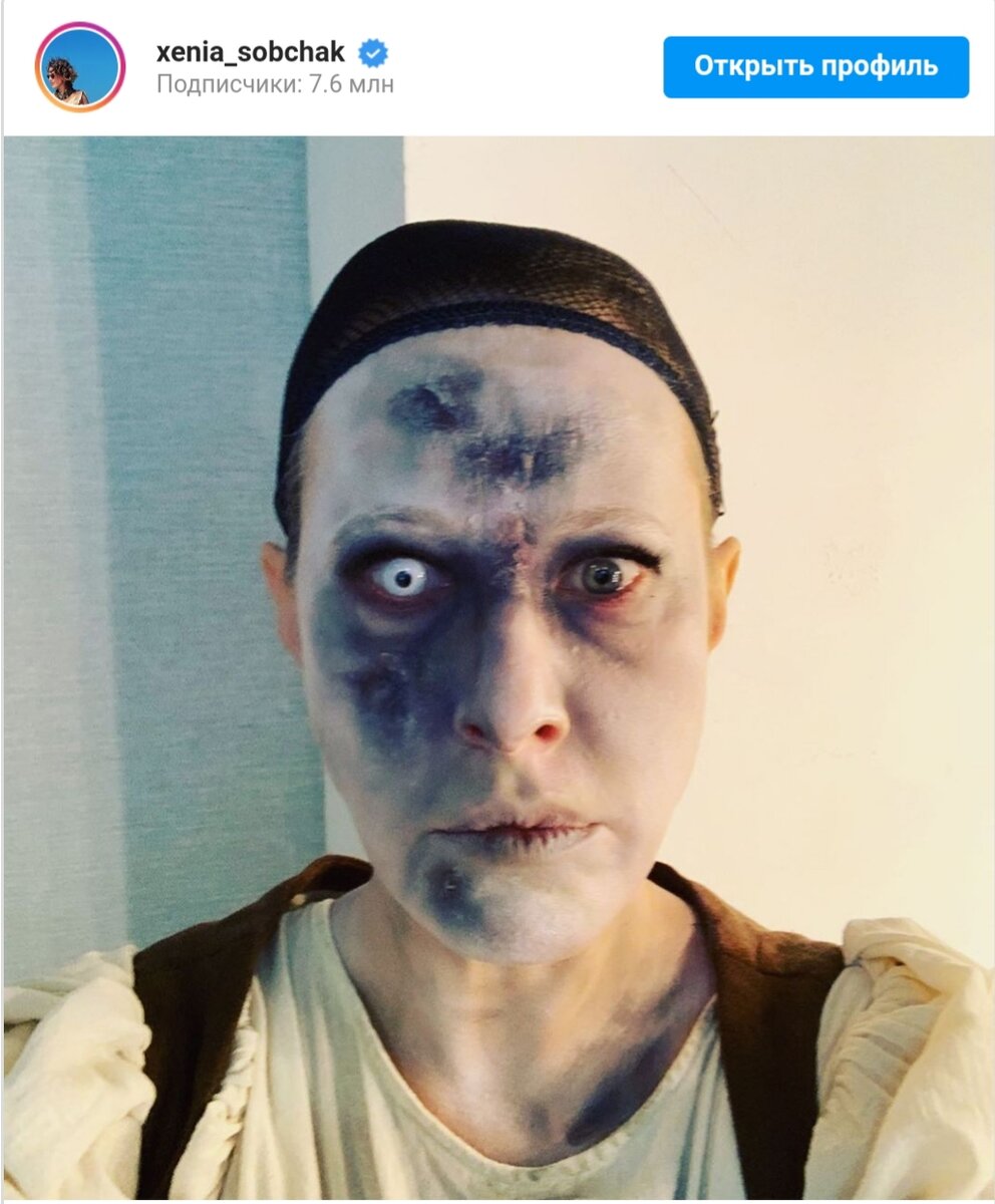 38-летняя телеведущая опубликовала шокирующее творческое фото в стиле «Ходячих мертвецов». После романтических фото с Константином Богамоловым Ксения Собчак решила опубликовать контрастное фото. Телеведущая предстала в образе из популярного фильма. Все ее лицо было покрыто плотным гримом — белоснежной основой с фрагментами фиолетово-синей плесени. На один из глаз Ксении гримеры надели белоснежную линзу с маленьким зрачком. Для полной образа телеведущая «лишилась» бровей, волос и ресниц, а из одежды выбрала растянутую белую блузу. Под загадочным и шокирующим снимком Ксения написала: «Природа щедро наградила меня чувством юмора. Но на этом подарки не закончились». Фолловеры ужаснулись образом Ксении, но похвалили за решительность: «Вы, конечно, очень смелая женщина!», «Я испугалась, но ВАУ», «Ого, как страшно, но очень творчески». Некоторые фанаты решили оставить ироничные комментарии: «Вылитая моя теща», «Что ты тут рекламируешь?», «Ну наконец-то косметику смыла».