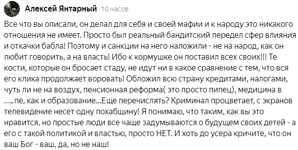 В 2011 году меня покоробили митинги протеста, где протестующие, называющие себя креативным классом, не видевшие лишений 90-ых и выросшие в относительно спокойное и сытое время, поливали помоями человека, который спас страну от развала и начал планомерно восстанавливать её. Пусть иногда это делалось с ошибками, пусть даже с частично не выполненными обещаниями и недостатками, которые всем бросаются в глаза, в отличие от удачных и успешных решений, которые замалчиваются, принижаются и высмеиваются, но тем не менее восстановление промышленности, сельского хозяйства, армии, а также улучшение жизни людей продолжалось. Некоторые наши неблагодарные или слегка "незрячие" граждане не видели вокруг никаких перемен или видя умышленно говорили, что для народа ничего не делается. Поэтому я стал противодействовать этой пропаганде в социальных сетях, начал вести тематические фотоальбомы в "Одноклассниках" (первый, второй, третий, четвёртый, пятый, шестой, седьмой), используя материалы сайта "Сделано у нас" и другие источники, где показывал, как развивается страна и что в ней происходит хорошего, потому что в интернете шло сплошное очернение власти и всего, что происходит в России, выпячивалось только всё самое плохое, а о хорошем никто ничего не рассказывал, как будто его и не было. В недавней статье (ссылка) я рассказал о том, какую массу полезных для страны дел успел сделать Путин всего лишь за первые восемь лет своего правления и сразу получил массу ёрнических комментариев, в которых люди признавали очевидное, но тут же издевательски спрашивали меня, почему же я не рассказал о том, что хорошего сделал Путин в последующие годы, ведь по их мнению ничего хорошего в стране за следующие 12 лет не происходило, а президент успокоился на достигнутом. Я, естественно, обещал рассказать об этом в дальнейшем и "поднять им веки" ещё раз. Однако были и ещё более безапелляционные высказывания. Вот одно из таких.