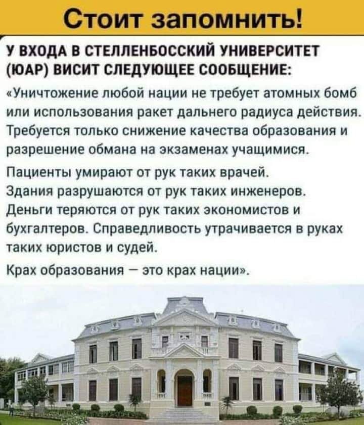Отличные слова - это именно то, что сделано в нашей стране - уничтожение нации через снижение качества образования... Мы давно скатываемся в средневековье, и каждый раз думаешь, ну теперь точно дно... И тут, как в анекдоте - «но вдруг снизу постучались» Из-за сложившейся ситуации в стране многие родители считают, что лучше отправить детей учиться за рубеж. Пусть даже это будет не самый престижный ВУЗ мира, так как финансово это доступно не всем казахстанцам, но можно найти недорогое образование или даже бесплатное. В любом случае, знания ребенок получит лучшего качества, чем в нашей стране. И это будет отличной стартовой площадкой для хорошего будущего ребенка. Что даст обучение за рубежом? А после окончания сам решит, вернуться на родину или остаться за рубежом. Хочется надеется, что через несколько лет все изменится в Казахстане и будут возвращаться наши земляки, чтобы передать знания следующему поколению, и тогда начнется расцвет страны. Знаю, что я наивная, но мне х