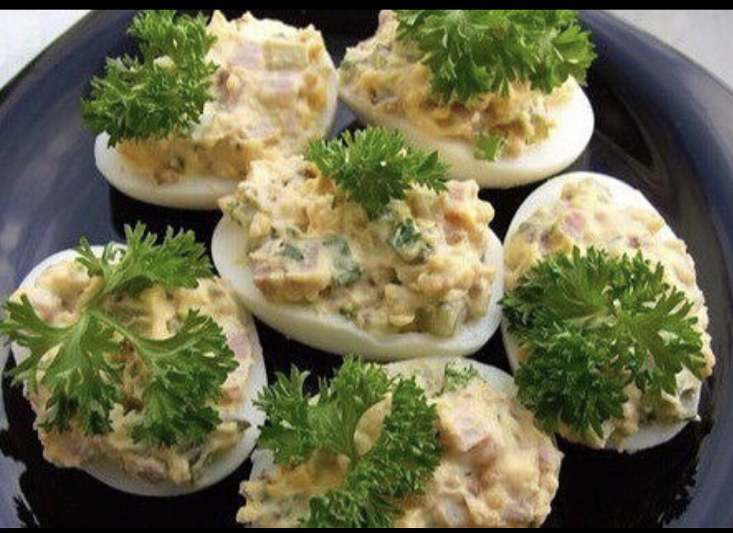 Фаршированные яйца - превосходная закуска для праздничного стола! Итого на 100 гр 120 ккал Б/Ж/У 11.2 / 7.3 / 1.5 Ингредиенты: Яйца - 6 шт Куриное филе - 60 г (вареное) Соленый огурец - 1/2 шт Зеленый лук - 5 г Натуральный йогурт - 3 ст. л Дижонская горчица - 1 ч. л Сельдерей - 10 г Соль, перец - по вкусу Приготовление: Яйца отварить вкрутую. Остудить, залив холодной водой. После очистить от скорлупы. Разрезать на половинки. Аккуратно вынуть желтки, чтобы не повредить белок. Нарезать мелко курицу и огурец. Сельдерей порезать мелко, смешать с вареными желтками и зеленым луком. Добавить к желткам, перемешать с йогуртом и горчицей. Должна получиться однородная масса. В каждую половинку белка с помощью чайной ложки накладываем приготовленную смесь. Выкладываем фаршированные яйца на тарелку. Сверху каждое яичко украсьте веточкой зелени. Приятного аппетита!🍴