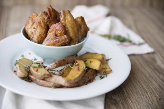 Всё очень просто, понадобится всего час времени и вкусный, большой стол, а главное не дорогой готов! Понадобится: Куриные крылья 700 гр.; Молодой картофель 1 кг.; Соевый соус; Масло подсолнечное; Сметана; Соль и перец; Черный хлеб; Чеснок. 1. Берем крылья, кладем в миску, солим и перчим по вкусу, добавляем соевый соус, перемешиваем и оставляем на 15 минут мариноваться. Выкладываем на протвень (лучше застелить фольгой) и помещаем в разогретую до 180-200 градусов духовку на 30 минут. Готово. 2. Берем черный хлеб, нарезаем на кусочки-гренки. Разогреваем сковороду, добавляем масло, выкладываем хлеб, обжариваем с двух сторон, посыпаем немного солью и натираем чесноком. Готово. 3. Берем картофель, чистим (или нет, по вкусу), нарезаем дольками, кладем в миску, солим, перчим, добавляем масло подсолнечное и перемешиваем. Выкладываем на протвень каждую дольку отдельно (лучше застелить фольгой) и помещаем в разогретую до 180 градусов духовку на 25 минут. Готово. 4. Берем сметану, подсаливаем её и