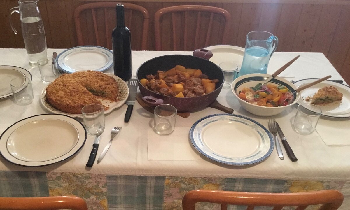 на второе — тушеное говяжье мясо с овощами(spezzatino di vitello — спеццатИно ди витЭлло).