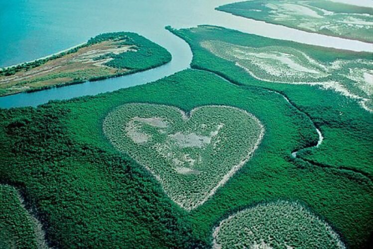 На планете много мест до сих пор малоизведанных человеком. Поэтому, даже сегодня встречаются такие географические открытия, которые способны удивить современного человека. Так, лишь в 1990 году мир узнал о том, что на планете существует остров по своей форме напоминающий сердце, который назвали остров Сердце. Как и многие другие открытия, это тоже было сделано случайно. Причем сделал его не какой-то исследователь или географ, а обычный французский фотограф, снимающий для своей книги тихоокеанское побережье Новой Каледонии, который впервые фактически случайно запечатлел островок причудливой формы, созданный в болотистой местности самой природой. Нерукотворное чудо – остров Сердце Каково же было его изумление, когда на готовых фотографиях одного из островов он заметил, что тот по своей форме напоминает сердце. После этого остров получил соответствующее своей форме название и стал знаменитым на весь мир благодаря сети интернет, где были размещены его фото. На фоне морской лазури зеленые б