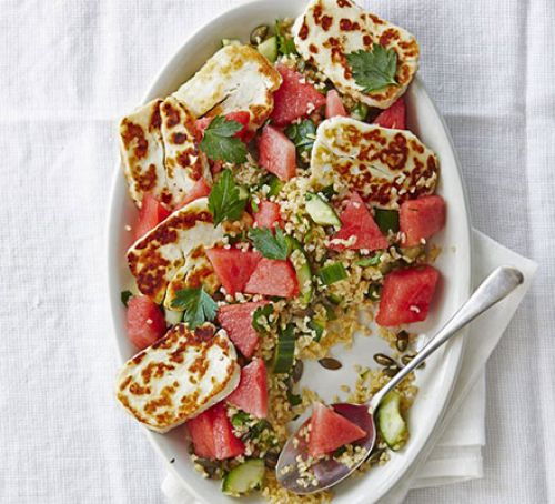 Метод Ингредиенты: -200 г булгур пшеничный. -50 г тыквенных семечек. -3 столовые ложки оливкового или рапсового масла. -250 г упаковки сыра халлуми, нарезанного на 10-12 ломтиков. -1 огурец, разрезанный вдоль пополам, семена вычерпать и нарезать ломтиками большой пучок петрушки , мяту, кориандр или базилик, или смесь, мелко нарезанную, оставив несколько листьев для подачи на стол цедра и сок 2 лимонов. ¼ Арбуза , нарезанный на куски, или готовая упаковка весом 400 г.