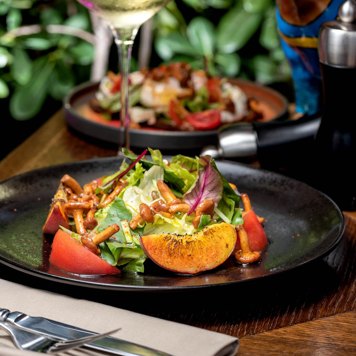 5/ Соединить в миске листья салата, огурец, томаты, добавить дольки нектарина и лисички.