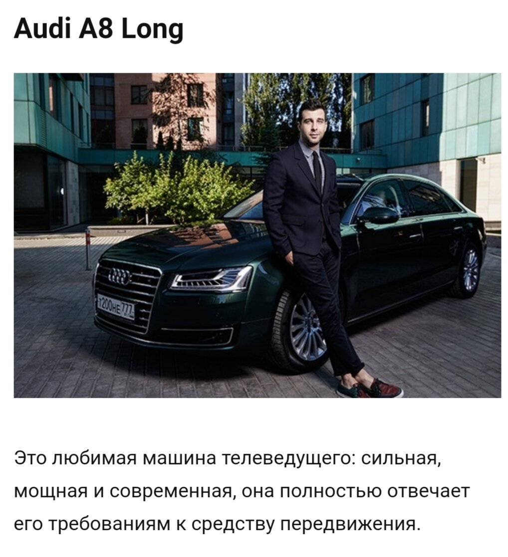 ,,Проехать ранним летним утром выходного дня по полупустым улицам Москвы — это чистое удовольствие, – рассказывает он в своих интервью. – Моя нынешняя Audi A8 Long из тех машин, в которых приятно сидеть и за рулем, и на месте пассажира. За годы владения ей, я ни разу не усомнился в правильности своего выбора." Range Rover