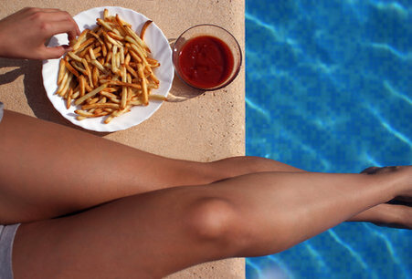 Хотя лето кажется идеальным временем для похудения, на самом деле все наоборот. Аромат салатов легко заменить жареными блюдами в бассейнах и фаст-фудах. На вашем пути будут летние посиделки с друзьями с бокалом вина, вечеринки, барбекю и праздники. Научитесь предвидеть эти ситуации и справляться с ними, чтобы избавиться от лишних килограммов и в то же время насладиться летом в полной мере. Бассейн с аттракционами Летом бассейны трещат по швам. Если вы активно плаваете или просто искупаетесь в воде, как только вы вернетесь на лежак и некоторое время позагораете, ваши мысли потеряются в еде. Многие бассейны заставлены киосками быстрого питания, откуда доносится запах картофеля фри, гамбургеров и прочего фастфуда. Несмотря на все усилия по похудению, противостоять подобному очень сложно. Не оставляйте еду на волю случая и берите с собой сытные закуски, которые не испортятся в жару. Прихватите цельнозерновой хлеб, добавьте сыр и не забудьте с собой нарезать овощи и фрукты. В основном мы ре