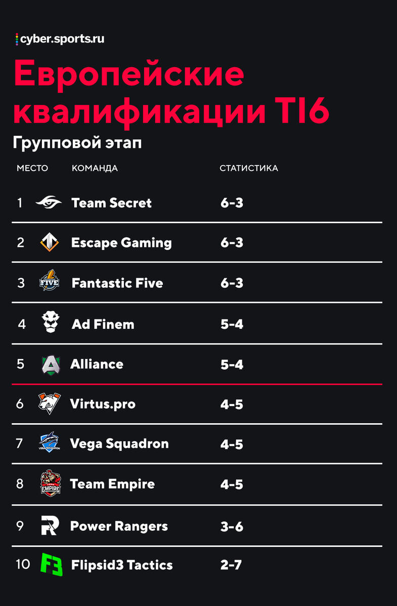 Нижняя точка СНГ-Доты. СНГ-Дота сейчас переживает не лучшие времена. В регионе нет крепкой тир-1 команды и неясно, скоро ли она появится. Европа обыгрывает СНГ на всех крупных турнирах, хотя весь топ европейского ладдера в игроках именно из СНГ. Но был момент, когда ситуация была еще хуже – The Interntaional 2016. На турнир тогда попали только Нави, но и они заняли последнее место, а другие команды поголовно провалились еще в квалификациях. И лишь один человек тащил весь регион. Полный провал на европейских квалификациях Изначально в европейскую квалификацию на Инт пригласили аж 5 команд из СНГ (а всего было 8). Через открытую квалу отобралась еще одна – Fantastic Five с Пашей. Итого – из 10 команд в квалификации 6 были из СНГ. Как вы думаете, сколько из них прошли в плей-офф? Одна! Fantastic Five. А ведь до квал среди СНГ-команд были совсем другие фавориты. В квалах их объединяет одно – счет 4-5 в группе. Вега. От победителей ESL до топ-7 квал на Инт Как играли до квал? Выиграли