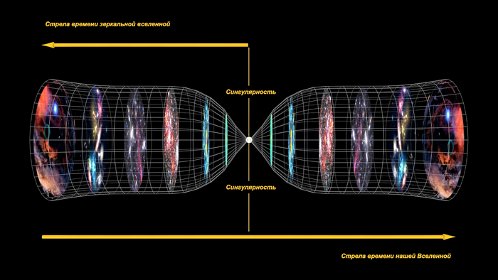 Но в этой вселенной причина все также предшествует следствию, так же, как и в нашей Вселенной. И время с точки зрения населяющих эту вселенную существ движется от Большого взрыва, так же как и в нашей. Однако мы сами существуем как-бы в прошлом этой «зеркальной вселенной».
