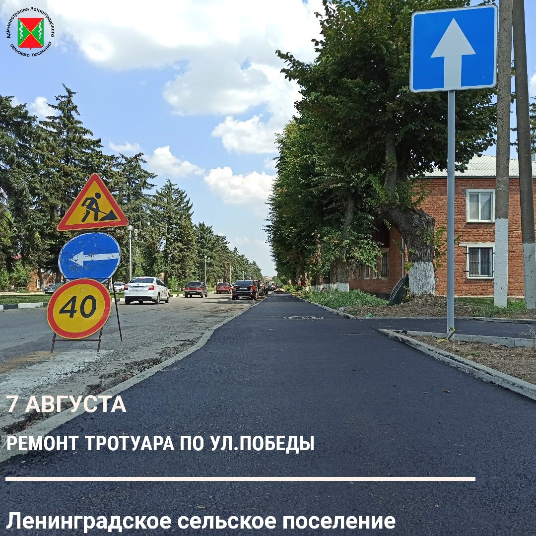 В ст.Ленинградской приступили к асфальтированию тротуара по ул.Победы. Покрытие на площади 2281 кв. м., заменят по правой стороне от ул.Вокзальной до ул.Коммунальной и по левой стороне от ул.302-ой Дивизии до ул.Вокзальной (по ходу движения от светофора ЦРБ). Общая протяженность тротуара 1188 метров. В местах где тротуар примыкает к проезжей части будут установлены перильные ограждения. Работы ведутся в рамках краевой программы «Строительство, реконструкция, капитальный ремонт и ремонт автомобильных дорог общего пользования местного значения».