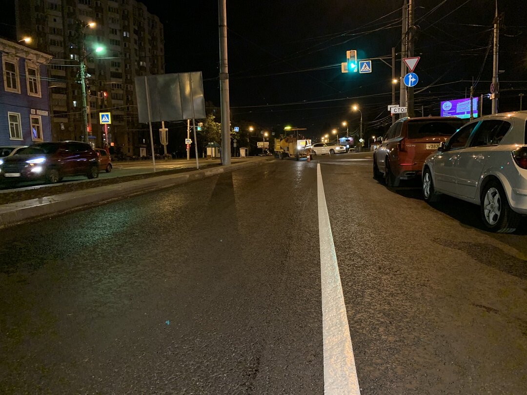 Готовность участка составляет уже 84%. В Самаре продолжается ремонт улицы Ленинской. Речь идет про участок от Полевой до Чкалова. Работы идут по нацпроекту «Безопасные и качественные автомобильные дороги», инициированному президентом Российской Федерации Владимиром Путиным. Готовность составляет уже 84%, сообщает администрация Самары. Так, в ночь на четверг, 6 августа, специалисты продолжили наносить дорожную разметку. До этого она уже появилась на четной стороне улицы. Перед работами улицу очистили пылесосы. Сначала специалисты вручную делают предварительную разметку. После этого спецмашина с бортовым компьютером определяет типы и ширину линий, длину штрихов. Окончательную разметку наносят термопластиком. Это термоплавкая сыпучая смесь полимеров, минеральных наполнителей, пигментов и функциональных добавок. После разогрева, вымешивания и охлаждения образуется толстослойное твердое непрозрачное лакокрасочное покрытие. — Смесь нагревается до 200 – 210 градусов и наносится на асфальт. С
