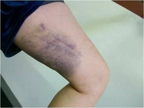 Сосуды, которые лопаются на ногах, могут формировать кровоподтеки различной формы. Например, в виде синяка или гематомы, которая, в отдельных случаях, достигает значительных размеров виде большого пятна. Такая гематома провоцирует возникновение болевых ощущений, носящих постоянный характер.