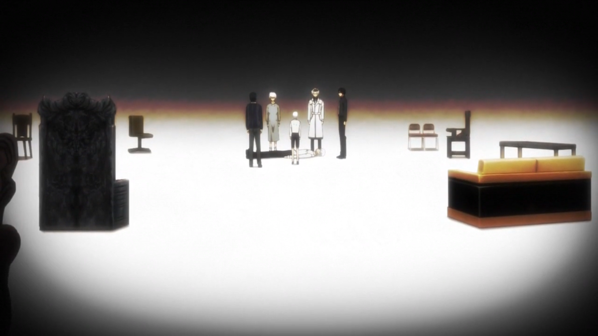 "Токийский гуль " также не является исключением . Хотя бы вспомним пристанище личностей - навсегда врезавшийся в память Канеки жуткий зал с окровавленными плиточками, которые разложены в шахматном порядке , и стулья для пыток . В этом до боли знакомом месте личности поддерживают друг друга и решают, кто из них получит "свет ".