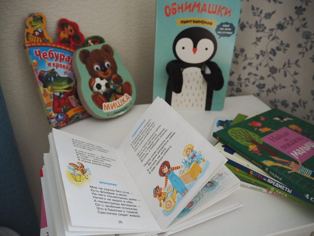 Эта статья про книги, которые мы читали дочке до года и которые нравились ей. Я начала показывать картинки и читать дочке с двух месяцев. Все книги выбирала с яркими иллюстрациями и минимальным количеством текста. Я читали ей несколько раз в день, показывала картинки, а она смотрела и слушала. Иногда я брала книги без картинок с длинным текстом, но это было во время Ульяшиных игр. Она лежала и играла, а я ей читала. Это удачное время для начала, малыш в таком возрасте никуда не может убежать или уползти и ему все интересно. Сейчас дочке 2 года и 5 месяцев и она уже слушает длинные рассказы, сказки или стихотворения, либо несколько маленьких подряд. Чтение занимает у нас около 1-1,5 часов в день. Но Ульяша всегда просит больше. Недавно мы с мужем очень удивились, когда дочка стала договаривать нам ВСЕ стихотворения, которые мы читали ей когда-либо, то есть она договаривает последнее слово в каждой строчке в: «Мойдодыр», «Телефон», «У лукоморья дуб зелёный» и в не менее чем двадцати мал