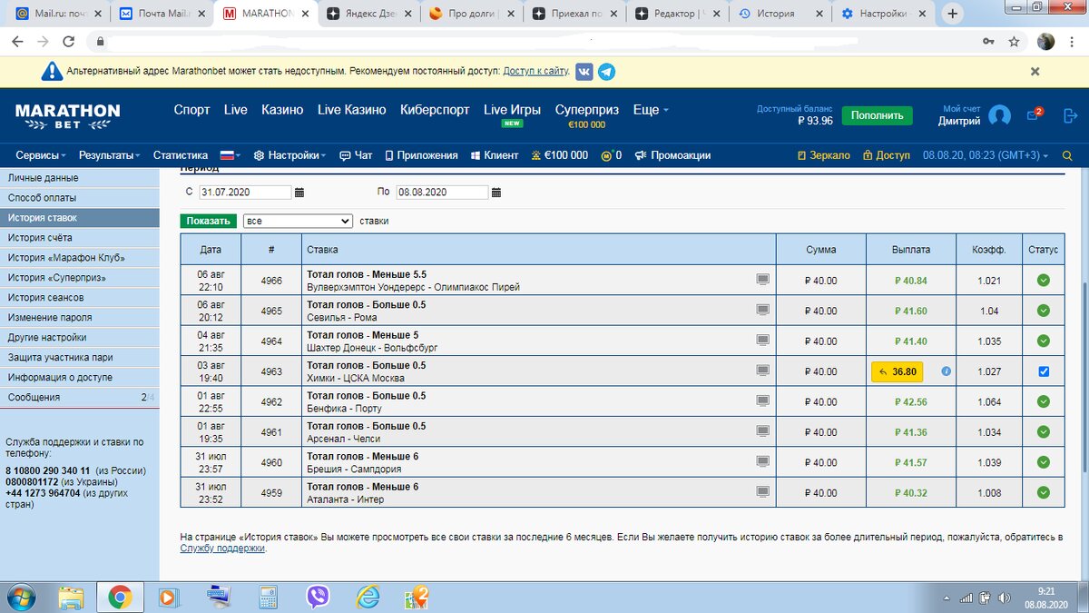 Сделал план по количеству ставок за август и так подвожу предварительные итоги на данный момент , сыграли ставки Вулверхэмптон Уондерерс - Олимпиакос Пирей тотал меньше 5.5 ( коэф. 1.021) - огромный запас, Севилья - Рома тотал больше 0.5 (коэф. 1.04) - сыграла в первом тайме, Шахтер Донецк - Вольфсбург тотал меньше 5 (коэф. 1,035) хороший запас по матчу только в концовочке забили 3, к сожалению не получилось выложить их до начала матчей по причине того что уезжал и ноутбук где у меня был пароль от zena остался дома поэтому показываю только сейчас общий коэффицент получился 1,241 или 24.1 % прибыли при плане за семь ставок 1,07 (7%). Также сделал ставку Химки - ЦСКА Москва тотал больше 0.5 (коэф. 1.027) ставка рискованная но на момент когда ставил не видел матчей (забыл про них) на которые можно было поставить (Лига Европы, Лига Чемпионов)
