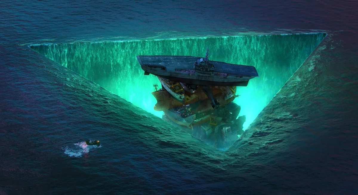 Возможно в глубинах бермудского треугольника находится когда-то населенный город - Атлантида, где проживали людишки волшебники и они поставили щит на Атлантиду, а он превратился в треугольник из-за того, что город пошёл ко дну. Ну вообщем, наш корабль идет ко дну :с