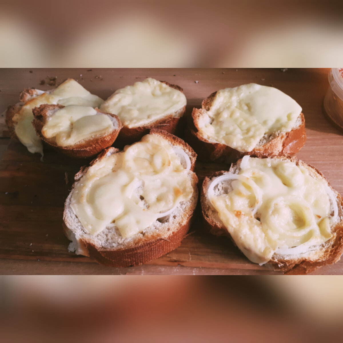 Свежеиспечённый хлеб, кольца лука и сыр пармезан.