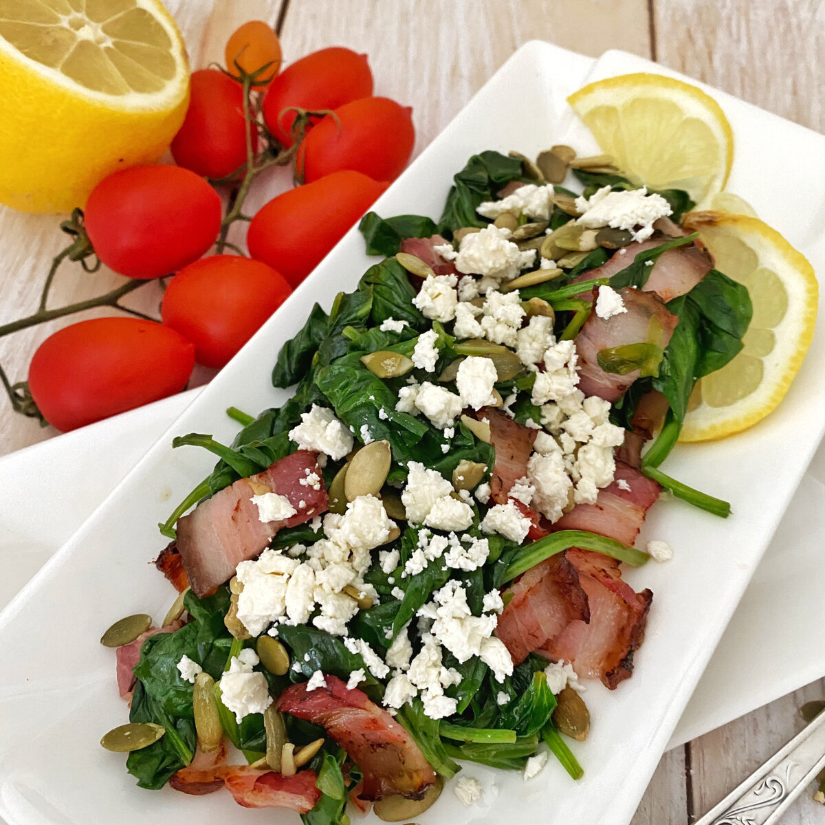 7. Кладем на тарелку шпинат с беконом, сверху крошим болгарскую брынзу, посыпаем тыквенными смесками и сбрызгиваем лимонным соком.
