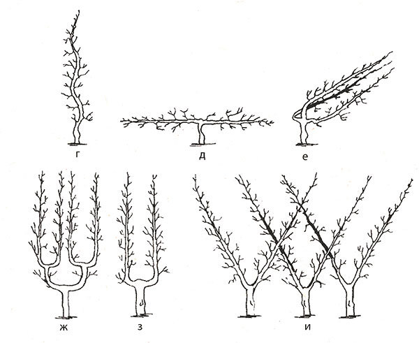 Кордон. Обычно деревья с кордонной кроной имеют один основной ствол с подрезанными боковыми ветвями. Чаще всего стволу придают наклон в 45* ( косой кордон), хотя направление роста остается вертикальным. Кордон хорошо растет на карликовом подвое. Ветви могут располагаться в 45 см от земли и выше, в зависимости от желаемого результата. Подходящие породы : яблоня, груша, слива. Шпалера. Шпалера так же имеет один главный ствол, но растет вертикально. Супротивные пары ветвей , растущие в стороны, прикрепляются горизонтально к проволоке, для создания правильной симметричной формы.Достичь этого трудно, поэтому многие предпочитают купить уже сформированную шпалеру. Ветви длиннее, чем в кордоне, так что шпалера занимает больше места, но выглядит привлекательнее. При этом деревья сохраняют высокую урожайность. Подходящие породы : яблоня, груша.