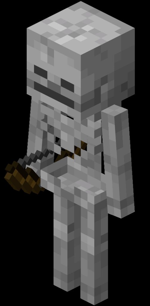 Скелет-это обычная враждебная толпа, которая стреляет стрелами и роняет 0-2 кости, 0-2 стрелы, доспехи (если они есть) и/или лук (скорее всего, используемый, однако есть небольшой шанс, что лук может быть зачарован ). Это первичные Ранговые мобы, с которыми игрок сталкивается во время пребывания в загробном мире. Скелеты (до 1.13) в настоящее время являются только одним из двух мобов, которые роняют кости, а другой-увядающий скелет. Кости могут быть использованы для приручения собак и могут быть обработаны в костную муку , которая используется для ускорения процесса роста саженцев и сельскохозяйственных культур . Как и зомби , скелеты появляются в темноте и имеют шанс появиться с броней. Они также горят на солнце и получают повреждения от огня, если только не находятся в тени, воде или не носят шлем. Скелеты ищут тень, когда их выставляют на солнце, чтобы они не сгорели при дневном свете. Когда стрела скелета попадает в другую враждебную толпу (кроме криперов и с помощью игрока, что
