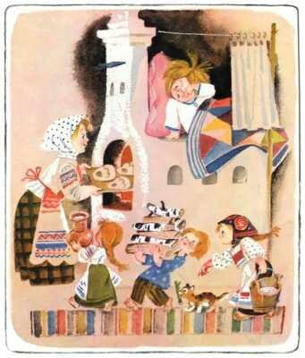 Баба Зоя взяла крылышко и быстрыми движениями начала обмазывать булки, калачи, рулеты. А прабабушка резво отправляла их в русскую печь, приговаривая: "Подрумянься, бочок, зарумянься, другой. Девчёнки, закиньте дровишек-то, да не жалейте, цельну охапку берите! Зарумянься, бочок, подрумянься, другой".