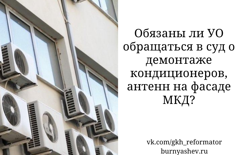 Можно встретить мнение, что УО обязаны обращаться в суды на собственников о демонтаже кондиционеров. Ведь, в большинстве случаев, установка проводится без согласований. Рассмотрим данный вопрос подробнее.