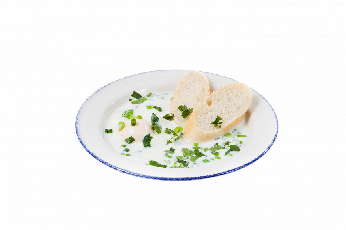 5. В тарелку положить одно яйцо, налить немного бульона, добавить черствого хлеба и украсить зеленью.