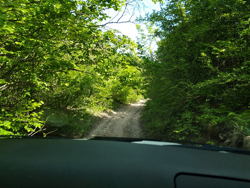 От гостиницы в селе Баштановка до смотровой площадки Кыз-Кермен 5,3 км. На машине получается немного больше, потому что дорога петляет. Дорога в принципе нормальная. Практически всю можно проехать на внедорожнике. Есть один неприятный участок - узкая дорога с наклоном в сторону обрыва. В общем, было немного стрёмно. Хотя когда я смотрел видео при подготовке маршрута было страшнее, чем на самом деле. В остальном дорога каменистая, довольно узкая, ветки свисают и бьют по машине, оставляют следы.