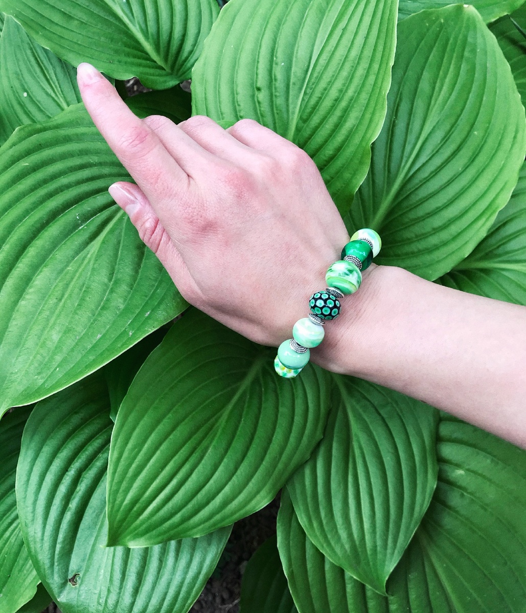Сочное лето на руке: сделала малахитовый браслет, намотав горячим стеклом зеленые бусины