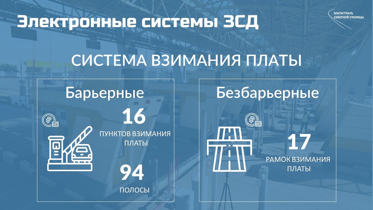 На Западном скоростном диаметре 16 пунктов взимания платы (ПВП).ПВП – это комплекс специализированных сооружений платной автомагистрали, оборудованный системами взимания платы за проезд, пропускного контроля и регистрации пользования платной автодороги.