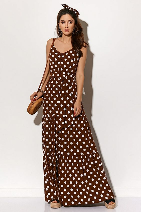 Свободный сарафан на тонких бретелях в горох – отличное решение для жаркого дня.