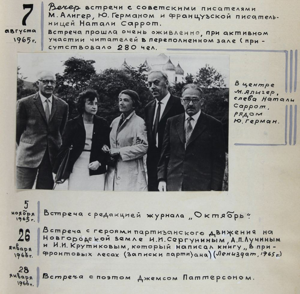 В 1965 году Натали Саррот посетила Новгород. 7 августа в стенах Новгородской областной библиотеки прошёл вечер встречи с советскими писателями М. И. Алигер, Ю. П. Германом и французской писательницей Н. Саррот. В летописи библиотеки сохранилась такая информация: «Встреча прошла очень оживлённо, при активном участии читателей в переполненном зале (присутствовало 280 человек)».