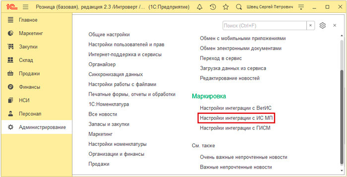 Активируем учёт табачной продукции. В первую очередь, необходимо настроить в 1С интеграцию с системой мониторинга оборота табачной продукции (МОТП). Для этого, заходим в раздел Администрирование и открываем Настройки интеграции с ИС МП.