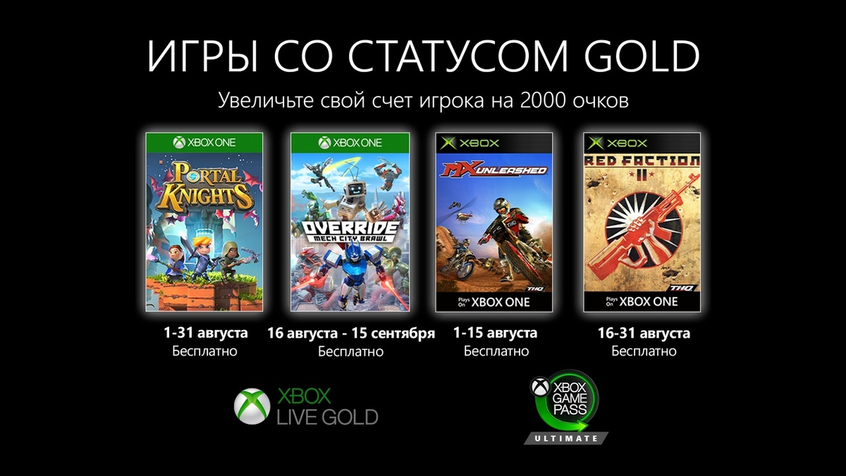 • Portal Knights – 1 - 31 августа;• Override: Mech City Brawl – с 16 августа по 15 сентября;• MX Unleashed – 1 - 15 августа;• Red Faction II – 16-31 августа.Как говорится, «Зато стабильно». Источник