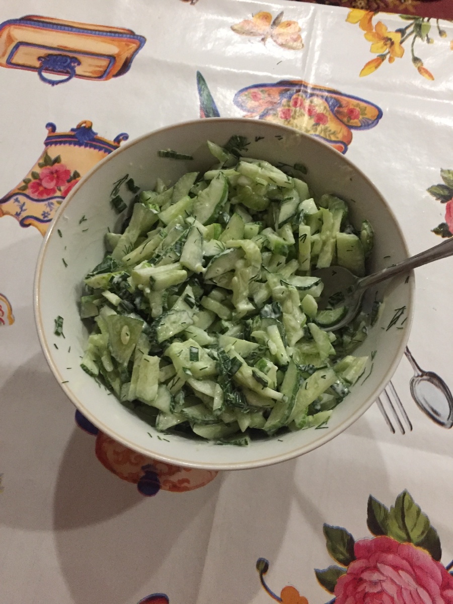Бывает, что куда то сильно торопишься и времени совсем не хватает чтобы сварить гречку с мясом, либо отварить лапшу. А у тебя в запасе около 5-10 минут. Тогда на помощь приходит салат из огурцов с луком. Наверняка у всех дома растут огурцы, так вот они как раз нам и будут помогать в перекусе. Смотрите, речь идёт не о полноценном приеме пищи, а только о быстром перекусе. И быстрая здесь считается готовка. Покажу вам сейчас наглядный пример того, что у меня получилось сделать. Тут такая не маленькая тарелка с огурцами. На неё в среднем уходит 5-10 минут у меня. Сам приём пищи не входит. Что нам для этого нужно: 1) берём свежие огурцы, срываем у себя в парнике или спрашиваем у соседей; 2) так же нам понадобится лук, можно зелёный, а можно и репчатый; 3) в качестве зелени подойдёт ещё петрушка и укроп; 4) тщательно моем все содержимое и режем на мелкие кусочки, примерно как на фото. 5) можно приступать к перекусу. По желанию можно добавить майонез или подсолнечное масло. Но я ничего не исп