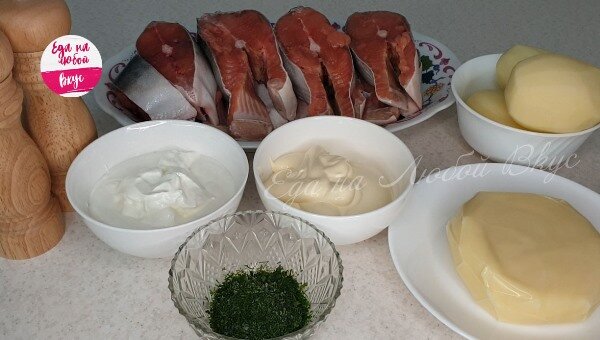 Горбуша в духовке получается мягкая, сочная и вкусная по этому рецепту. Набор ингредиентов минимальный, готовится горячее блюдо быстро, да и в холодном виде, если останется, тоже вкусно. Рыба запекается в духовке в соусе и с картофелем под фольгой, а сметана с майонезом и зеленью только подчеркивают ее натуральный вкус. Такое блюдо отлично подойдет к ужину или обеду, всегда будет к месту. Как приготовить горбушу с картошкой в духовке сочной и мягкой? Следуйте пошаговому рецепту с фото и у вас тоже все получится! В помощь найдете также видео рецепт! Удачного приготовления. Ингредиенты (4 порции): Как вкусно приготовить горбушу в духовке. Пошаговый рецепт 1. Горбуша не должна сильно разморозиться, так лучше ее подготавливать. Очищаем рыбу от чешуи, отрезаем плавники и хвост. Моем рыбу и делим на кусочки толщиной около 2 см., так называемые стейки. Затем каждый кусочек солим и оставляем пока. 2. Смешиваем в миске сметану и майонез, добавляем зелень и черный молотый перец по вкусу. 3. Каж