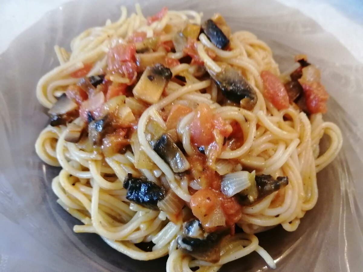 Простое в приготовлении, но очень насыщенное по вкусу и аромату блюдо. Из разряда тех, что можно приготовить на ужин за полчаса. Итак, поехали. Для противления пасты нам понадобятся следующие продукты: Как готовить: Сначала на разогретую сковороду с растительным маслом отправляем нарезанный лук. Для красивого цвета добавляем к нему шепотку куркумы, а для вкуса пару чайных ложек молотой паприки. Сюда же насыпаем сушеный чеснок. Если есть, можно взять и свежие зубчики. Нарезаем кубиками шампиньоны. И тоже отправляем на сковородку. Обжариваем грибы до золотистого цвета. Потом добавляем нарезанные помидоры, заливаем сливки, солим перчим и даем немного потушиться под крышкой. В отдельной кастрюле в подсоленной воде отвариваем спагетти. Варим до состояния аль-денте. Только ни в коем случае не промывайте их холодной водой. Подхватите сварившиеся спагетти шумовкой и на сковородку с соусом. Чтобы соус лучше прилипал к макаронам добавьте немного воды, в которой они варились. Перемешали спагет