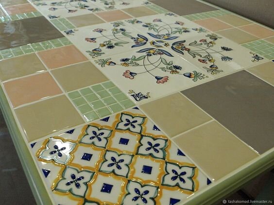 Творческим людям понравится эта идея. Остатки плитки от ремонта можно использовать для декора кухонного стола. Её можно разломать с помощью молотка, предварительно свернув в пакет. Или купить специальную плитку для декора. Далее наносим плиточный клей на поверхность, приклеиваем плитку. Ждём когда высохнет. После промежутки между плиткой замазываем специальной затиркой. Если она попала на плитку, просто протираем салфеткой или губкой. Ждём когда высохнет затирка и стол готов!