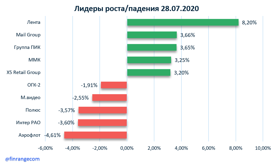 Акции Ленты продолжают ралли после вчерашней публикации сильных финансовых результатов за II кв. 2020 г. Но главный драйвер – это возможные дивиденды, которые ритейлер никогда не платил. Менеджмент Ленты сообщил, что может рассмотреть возможность выплаты дивидендов по итогам 2020 г. Акции Аэрофлота наоборот, сегодня в лидерах падения после сообщении о допэмиссии, о которой мы не раз предупреждали. Правительство одобрило допэмиссию акций авиаперевозчика с условием сохранения контрольного пакета у государства (51,2%). Яндекс опубликовал финансовые результаты за II кв. 2020 г. Выручка осталась на прежнем уровне по сравнению с аналогичным периодом прошлого года, также компания получила чистый убыток в размере 3,7 млрд руб. против прибыли в 3,6 млрд руб. годом ранее. Результаты в рамках наших ожиданий, о падении рекламных доходов мы писали в обзоре компании. Также сегодня по МСФО отчиталась Энел Россия. Показатели ожидаемо снижаются из-за продажи Рефтинской ГРЭС, об этом мы предупрежд