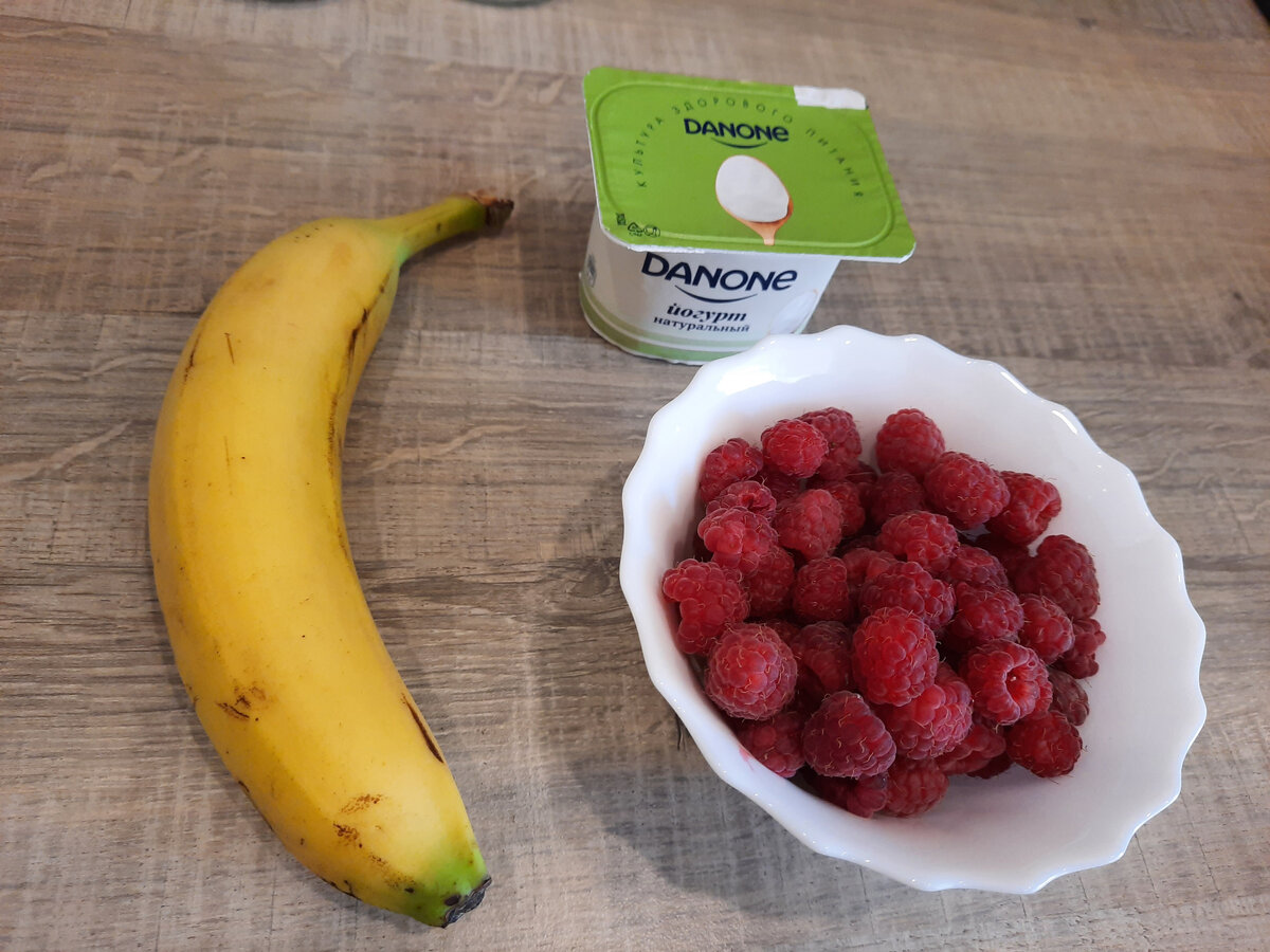 Наверняка все любят магазинные йогурты со всякими добавками, например, фруктами. Я не исключение. Раньше часто покупала себе и своим домочадцам баночки йогуртов с разными вкусами. До этого я как то не задумывалась из чего делают йогурт, вкусный да вкусный. Но повзрослев я начала читать составы продуктов, и иногда начинает дёргаться глаз от количества букв Е, ароматизаторов и красителей. А натуральный йогурт, без ничего - не всегда можно запихнуть в себя, т. к вкус на любителя. И сейчас в обычный натуральный йогурт я добавляю различные фрукты и мёд. Получается очень вкусно и гораздо полезнее йогурта из магазина с искусственными ароматизаторами. Нам понадобится: Фрукты и ягоды можно брать любые, какие вам нравятся и миксовать из них самые необычные вкусы. Банан нарезаем кружочками и отправляем в чашу блендера, туда же высыпаем малину и заливаем йогурт Все ингредиенты пробиваем в блендере, по желанию добавляем мёд. Выливаем в красивое блюдце и наслаждаемся вкусным, а самое главное полезн