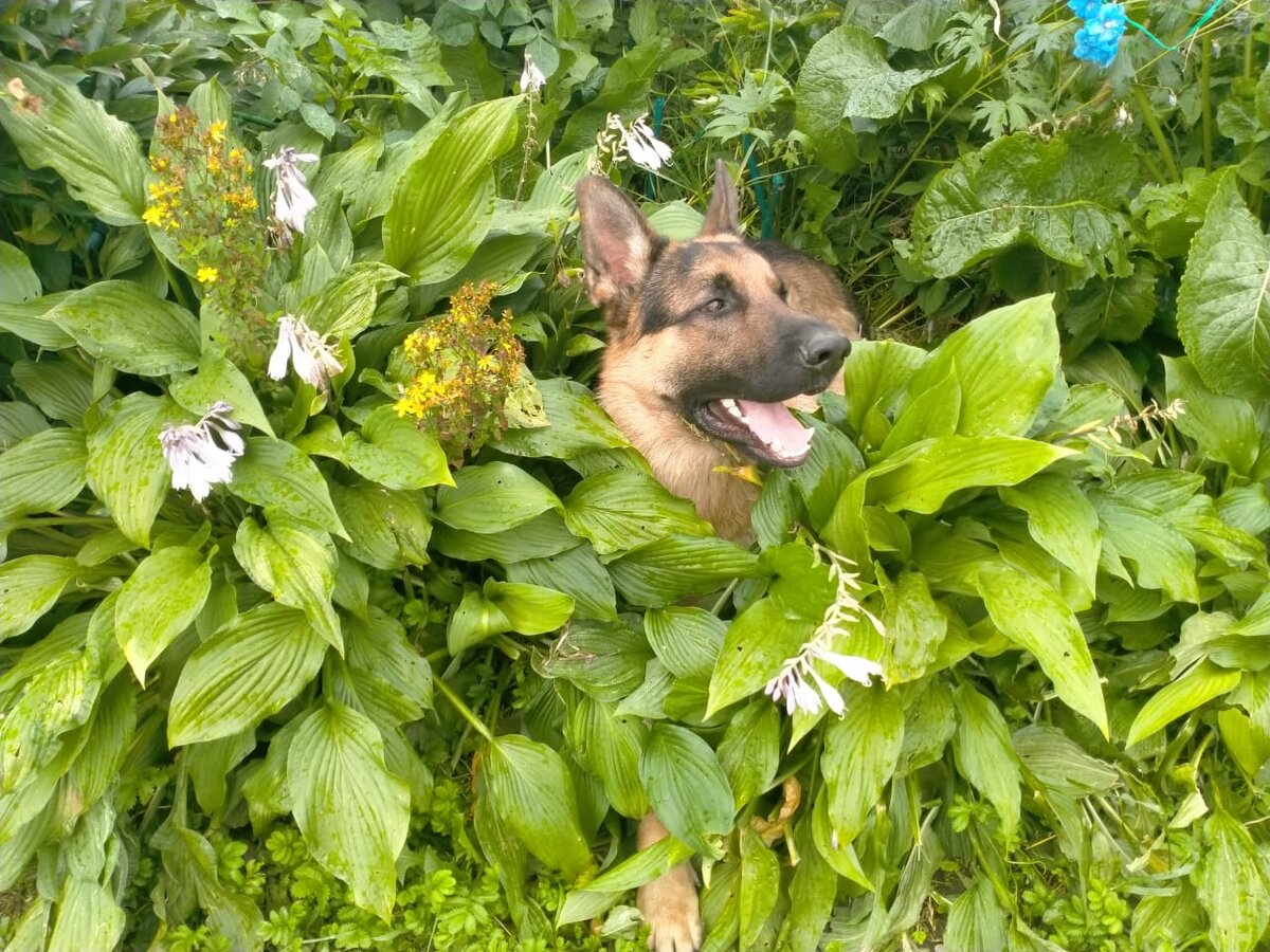 Скрываться от жары в цветнике - любимое занятие. Понимаю, что сейчас польется шквал обвинений про невоспитанную собаку... Для собаки в принципе разницы нет цветы или трава. В жару, конечно же тянет в зелень - она прохладная. И мне собаку жалко. Попробуйте надеть шубу и выйти на улицу в +25 или +30! А пёс так ежедневно ходит. Да ещё и бегает. Тяжко ему. Недавно по телеку была новость про хаски, который залезал в холодильник. Бедняга! Но по мне, так уж лучше пусть мой в цветы, чем в холодильник. Тем более, что он аккуратненько, просто слегка приминает растения, сильного ущерба не наносит. Да и хосты - неубиваемые. Зато какая красота - собака в цветах! Была бы художником - рисовала бы да рисовала. Пока лишь фотографирую. А ещё собака безошибочно, даже в облачную погоду, выбирает место где тень в данное время суток. Своеобразные солнечные часы. Ну и режим - как по часам. Спать, так спать.
