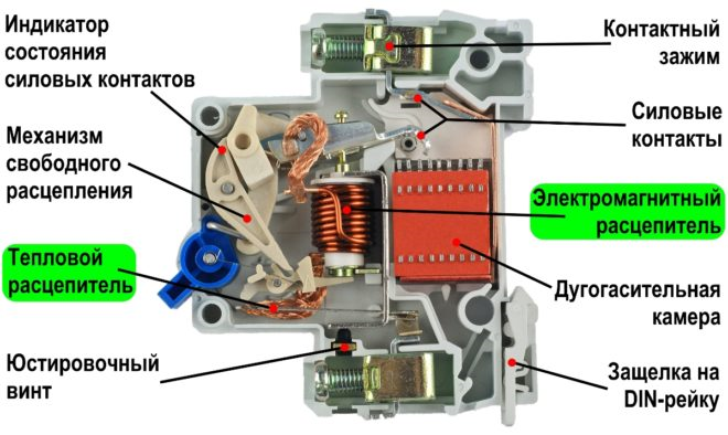 Наличием электромагнитного расцепителя обусловлена отключающая способность автоматического выключателя при воздействии на цепь сверхтоков короткого замыкания, выдержать которые позволяет обеспечить защиту провода и приборов от потока электронов, величина которого намного выше расчетной для кабеля конкретного сечения.