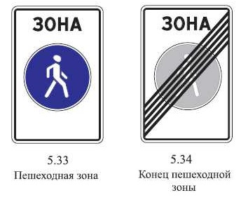 Пешеходной зоной является территория, предназначенная для движения пешеходов, которая обозначена знаками: • 5.33 "Пешеходная зона"; • 5.34 "Конец пешеходной зоны". Знаки 5.33 и 5.34 применяют для обозначения территории (участка дороги), конца территории (участка дороги), на которой разрешено движение пешеходов, а также велосипедистов в случаях, установленных правилами дорожного движения. Знак "Пешеходная зона" может применяться со знаками дополнительной информации (табличками), обозначающими, что пешеходная зона действует только в определенное время, например со знаком 8.5.1 "Субботние, воскресные и праздничные дни" или 8.5.5 "Время действия". Пешеходную зону следует отличать от жилой зоны, которая обозначается знаками 5.21 и 5.22. В жилой зоне пешеходы имеют преимущество, однако они не должны создавать необоснованные помехи для движения транспортных средств. Движение пешеходов в жилой зоне разрешается как по тротуарам, так и по проезжей части, а движение и стоянка транспортных средст