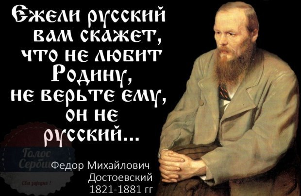 Наш великий Фёдор Михайлович Достоевский очень любил Россию. Настолько любил, что высказал в своё время замечательную и очень глубокую мысль: «Ежели Русский скажет Вам, что он не любит Родину, не верьте ему, он не Русский». Это ключ для понимания людей, оценивая их на национальное сознание. Нельзя быть по-настоящему русским, ненавидя Россию. И всё это при том, что Достоевский был и на каторге, и в солдатах. При всём при том, великий писатель видел не только достоинства, но и недостатки нашей страны и народа, но это не мешало ему ЛЮБИТЬ РОДИНУ ВСЕМ СЕРДЦЕМ. Русский можете любить или не любить Николая II, Сталина, Путина, политическую систему того или иного времени, но он будет любить Россию по определению. ПОТОМУ ЧТО ОН НЕ МОЖЕТ НЕ ЛЮБИТЬ СВОЮ РОДИНУ. А нелюбовь к родной стране - это уже приговор.