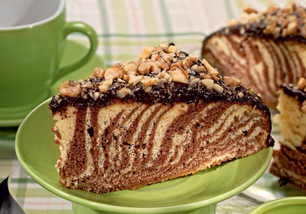Ингредиенты: - яйца 5 шт - сахар 180 г - сметана 200 г - сливочное масло 100 г - мука 2 стакана - пакетик разрыхлителя 10 г - какао 1 ст. л. Приготовление: 1. Взбейте яйца с сахаром до образования пузырчатой массы. 2. Добавьте размягченное сметану, сливочное масло, муку и разрыхлитель. Вымешайте до однородности. Густота теста должна получиться как на оладьи. 3. Половину теста перелейте в другую посудину. В оставшуюся часть добавьте какао и хорошо размешайте. 4. Начинайте выкладывать будущий пирог в смазанную маслом форму. 5. Выкладывайте в центр формы столовой ложкой поочередно белое и шоколадное тесто, пока не закончится тесто. 6. Зубочисткой или кончиком ложки проведите несколько неглубоких линий от центра пирога к краю. Получится красивый узор. 7. Выпекайте пирог в разогретой духовке при температуре 180 С примерно 35-40 минут.